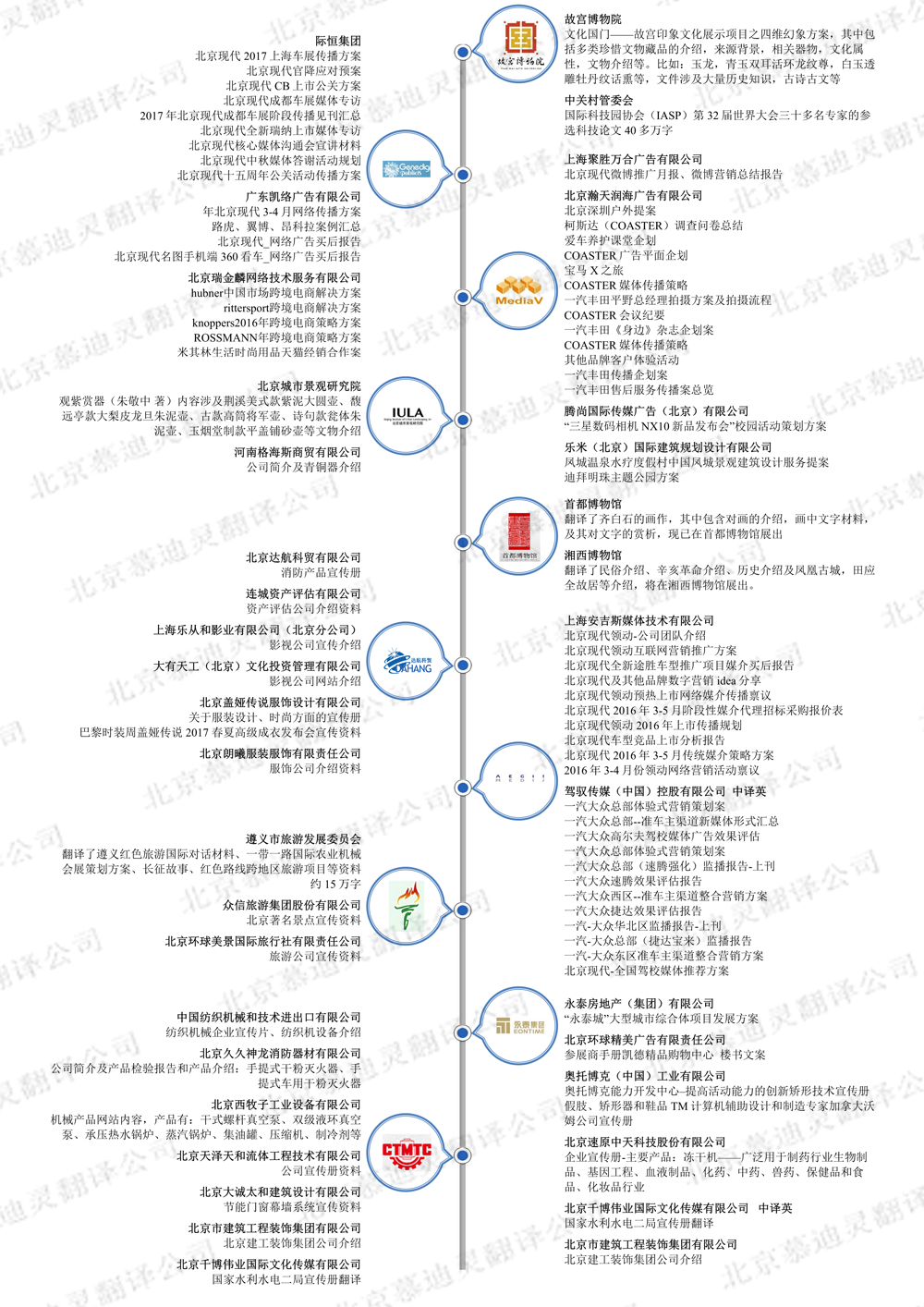 慕迪靈翻譯公司擅長營銷傳媒資料翻譯,長期以來一直致力于為各設計公司、廣告公司、傳媒公司、公關公司、咨詢公司及眾多全球跨國公司提供專業化的翻譯服務,并與他們簽訂建立了長期合作關系。翻譯主要涉及企業宣傳、宣傳PPT、畫冊、宣傳片字幕、宣傳片腳本、企業新聞、公司網站、產品性能介紹、折頁介紹、新聞策劃、地產樓書、商業策劃案、可行性分析報告、雜志報告、企業樣本、品牌樣本、宣傳海報、房地產文案、創意文案、企劃文案、品牌文案等翻譯工作。